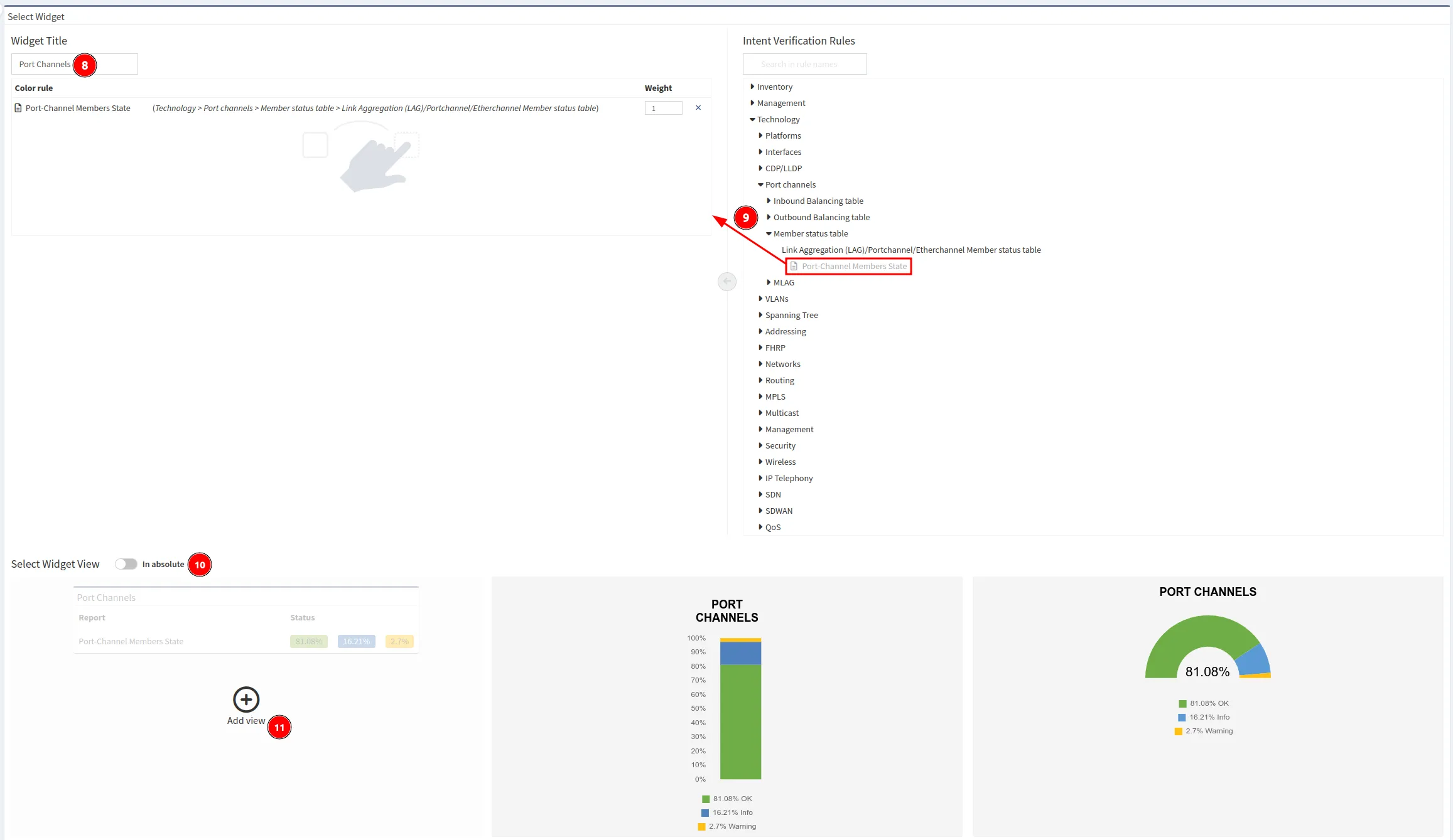 Port Channels. - Find an intent verification rule and add it to the widget. For example, Technology → Port channels → Member status table → Link Aggregation (LAG)/Portchannel/Etherchannel Member status table → Port-Channel Members State.
