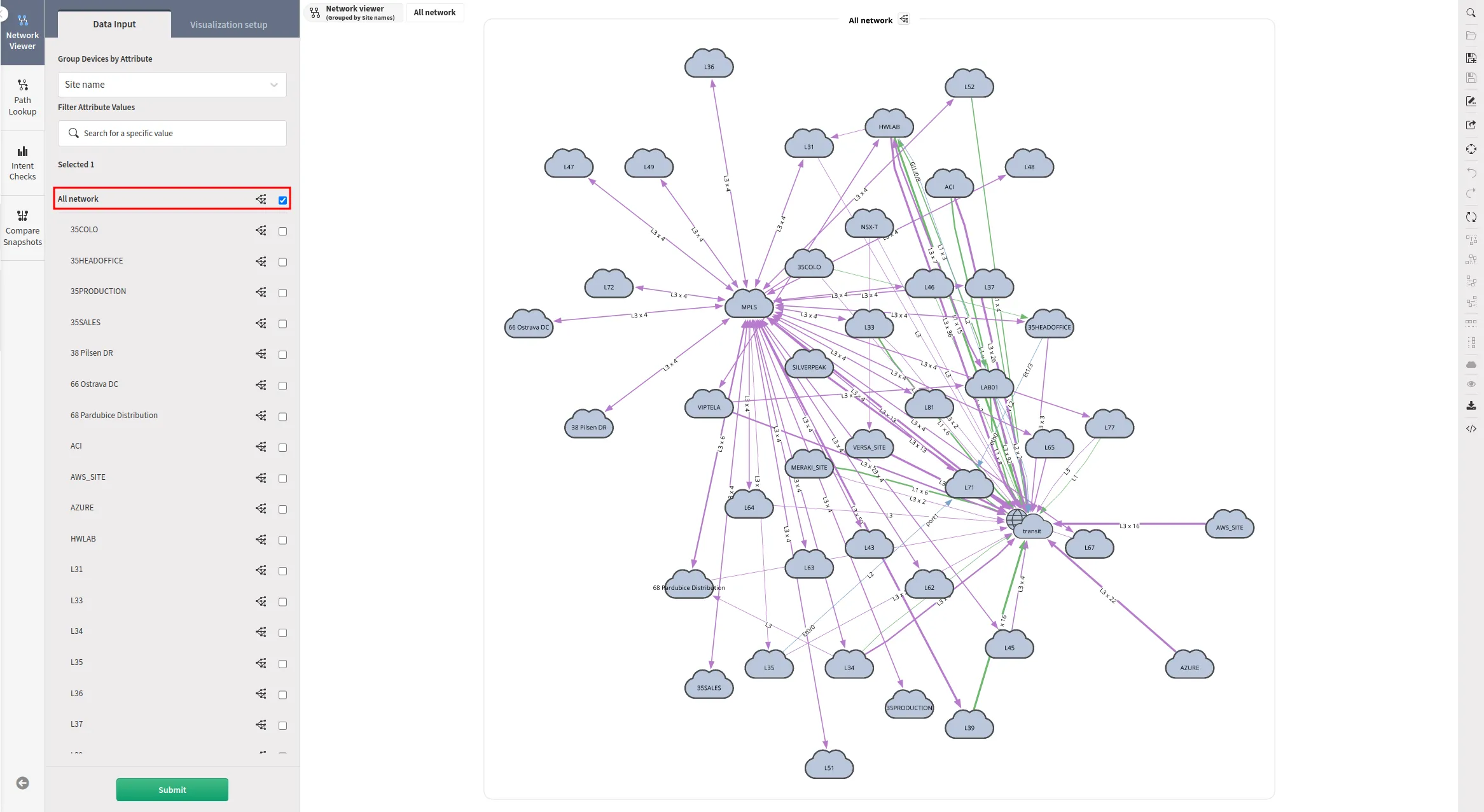 When you go to Diagrams → Network, all networks are displayed along with the relationships between them. They are grouped into sites (which are represented by clouds) for better visibility. You can double-click a cloud to explore further that specific site.