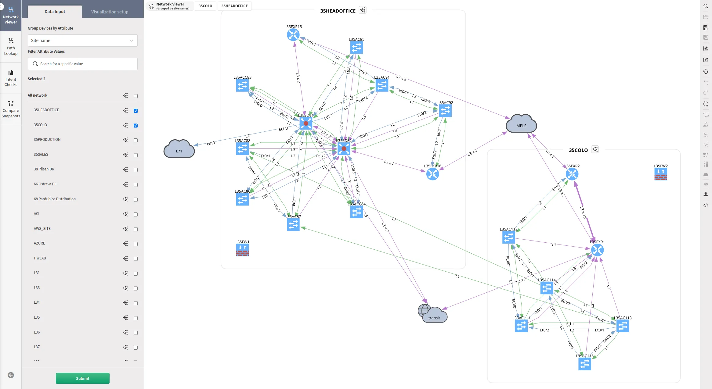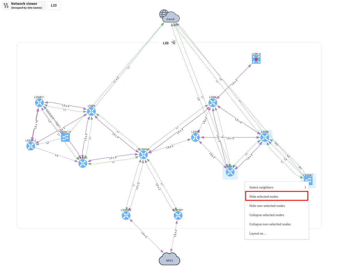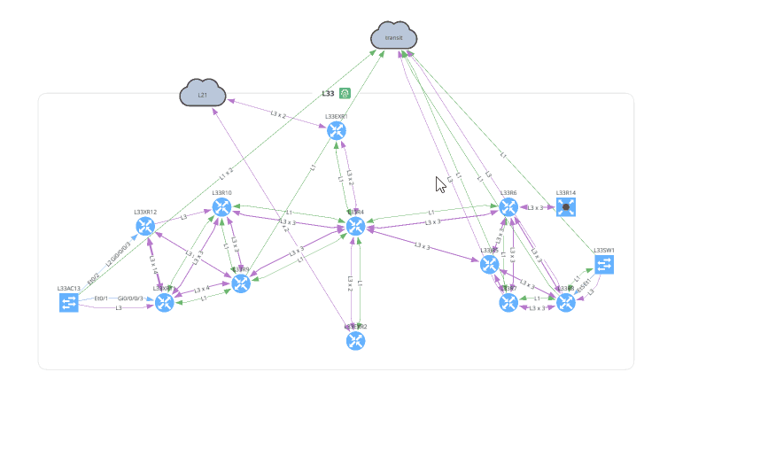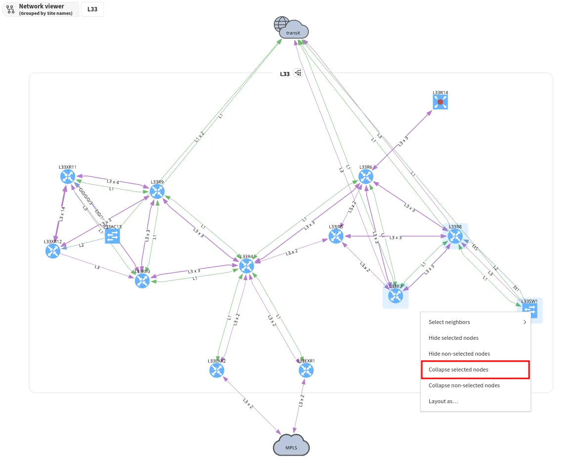 Layer grouping collapses groups of devices according to the types of links that connect these, either in Layer 2 or 3 groups. Devices connected with different layer protocols can’t be grouped together.