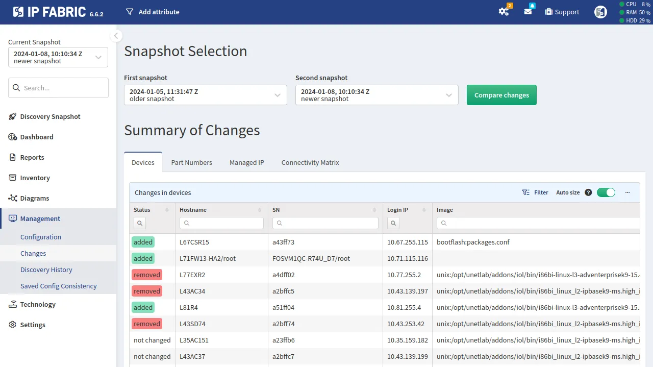 Changes in addressing can cause problems, particularly if they are not well communicated between teams. Any changes to the IP address can be viewed in this table. Status can be added, removed, or not changed.