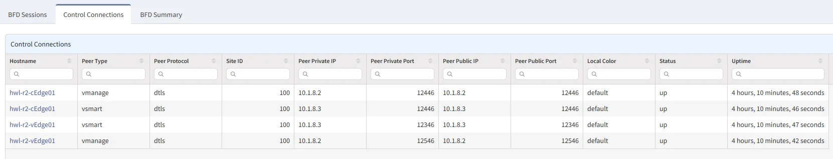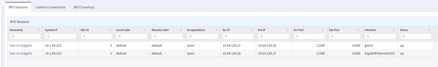 Viptela BFD Sessions The BFD Sessions tab contains the list of data plane connections. Control Connections The Control Connections tab contains the list of control plane connections. BFD Summary The BFD Summary tab contains summary of BFD sessions. Was this page helpful? Thanks for your feedback! Thanks for your feedback! Help us improve this page by using our support portal.