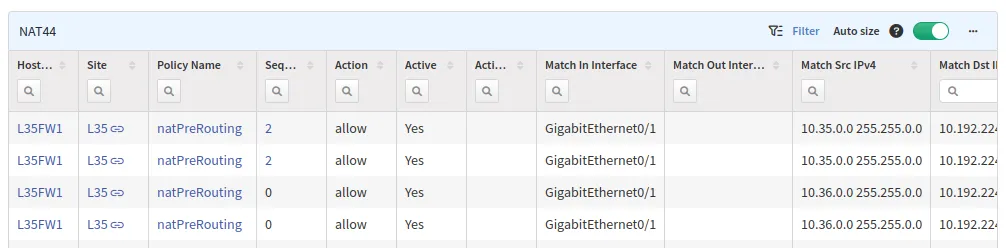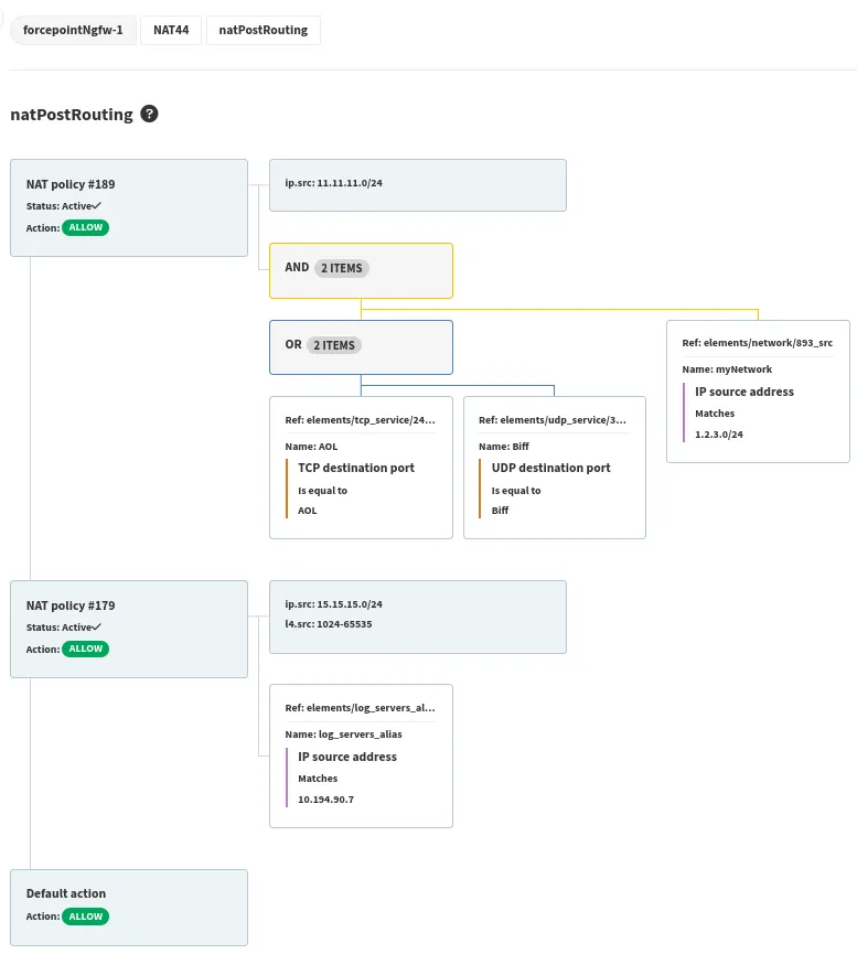 The NAT sub-section contains information about NAT policies and rules configured on a device. Currently, only IPv4 NAT is supported – in the NAT44 table.