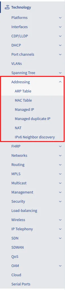 The Addressing section provides information about every IP address on every managed network infrastructure device.