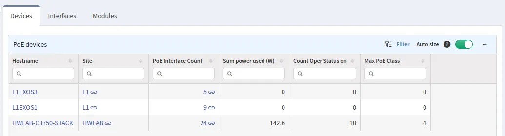 The Devices tab displays all devices that support the PoE protocol, the number of PoE interfaces, current power usage, the number of ports that uses PoE, and highest PoE class available on the device