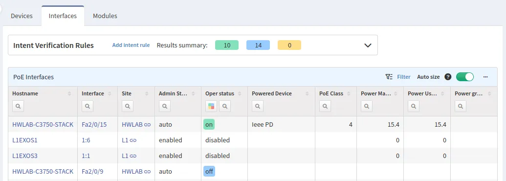 The Interfaces tab lists all interfaces that support the PoE protocol. Filters