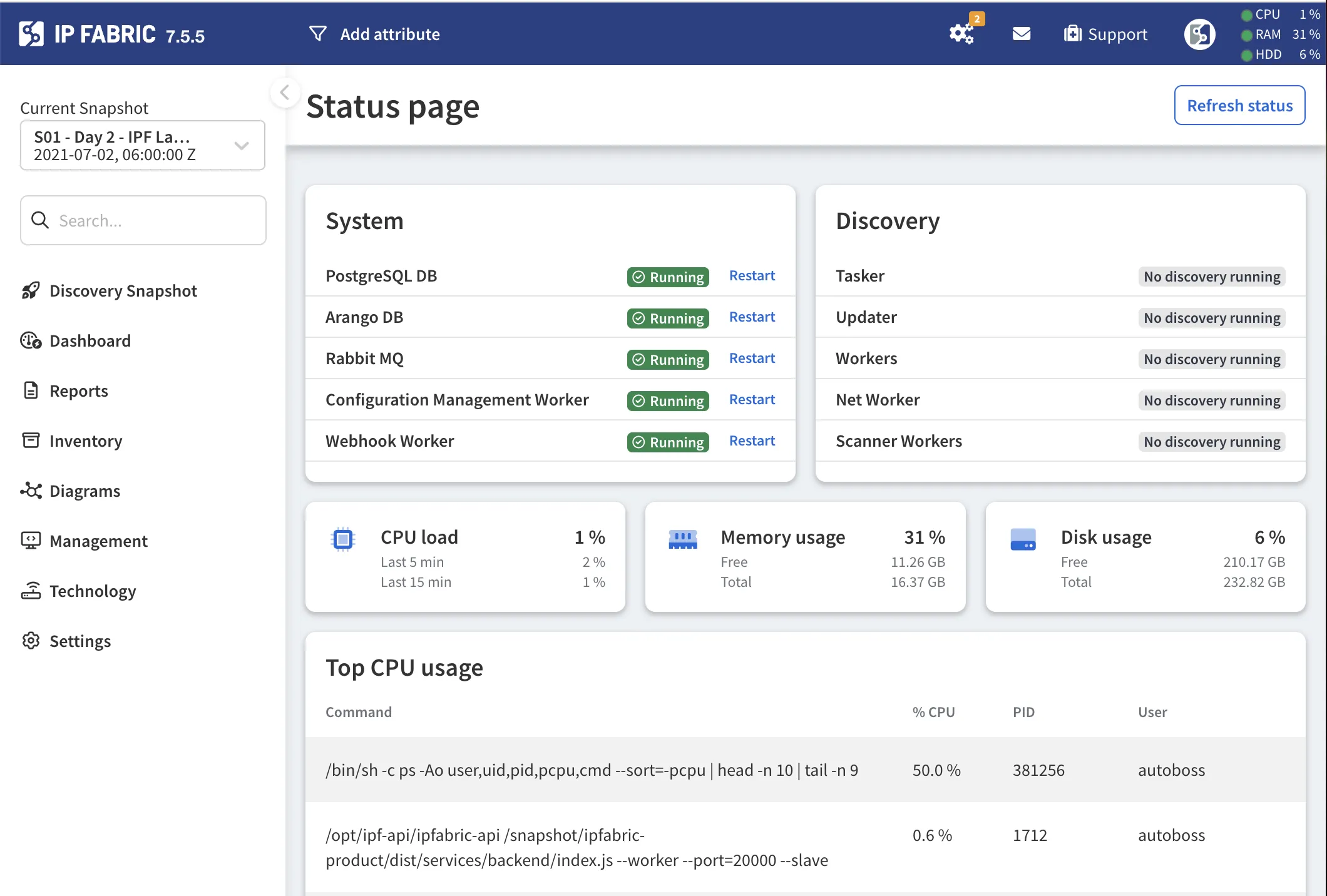 By clicking the CPU/RAM/HDD status located in the top right corner of the primary GUI, you will be redirected to the System status section. This section provides comprehensive information, including the current CPU load, RAM utilization, disk space consumption, and the status of currently running services.
