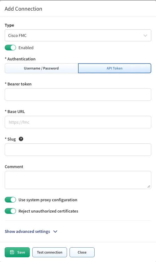API, click + Add, select Cisco FMC from the list, and fill in: