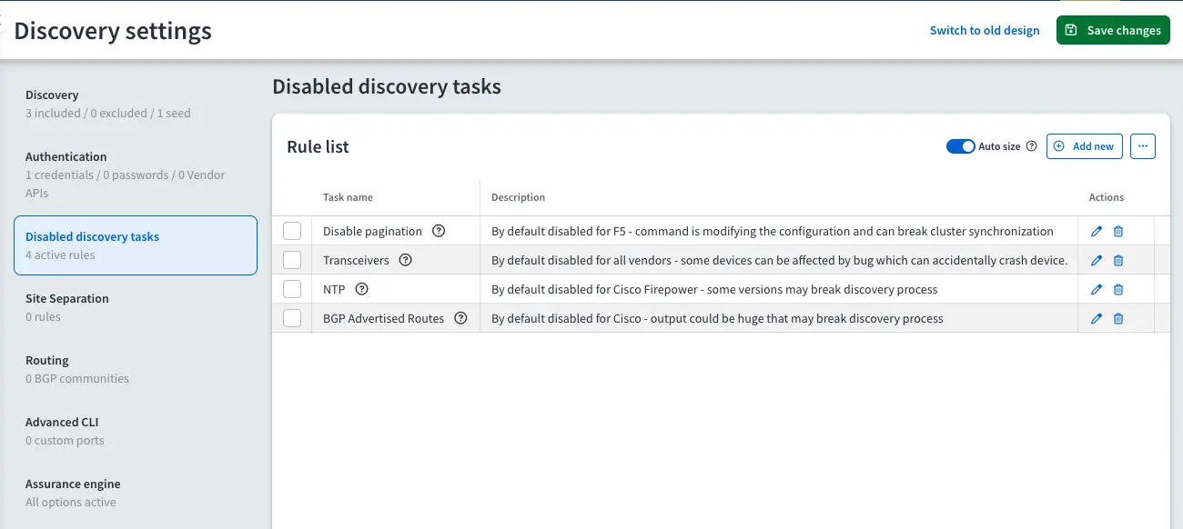 The discovery process for network devices is divided into multiple Tasks. A Task is data collection related to a specific network protocol or technology (MPLS, Transceivers, ARP Table, Spanning-Tree Protocol, Multicast, or VXLAN). Each Task consists of 1 or more operational commands (CLI or API). You can find the list of all Discovery Tasks in the Feature Matrix.