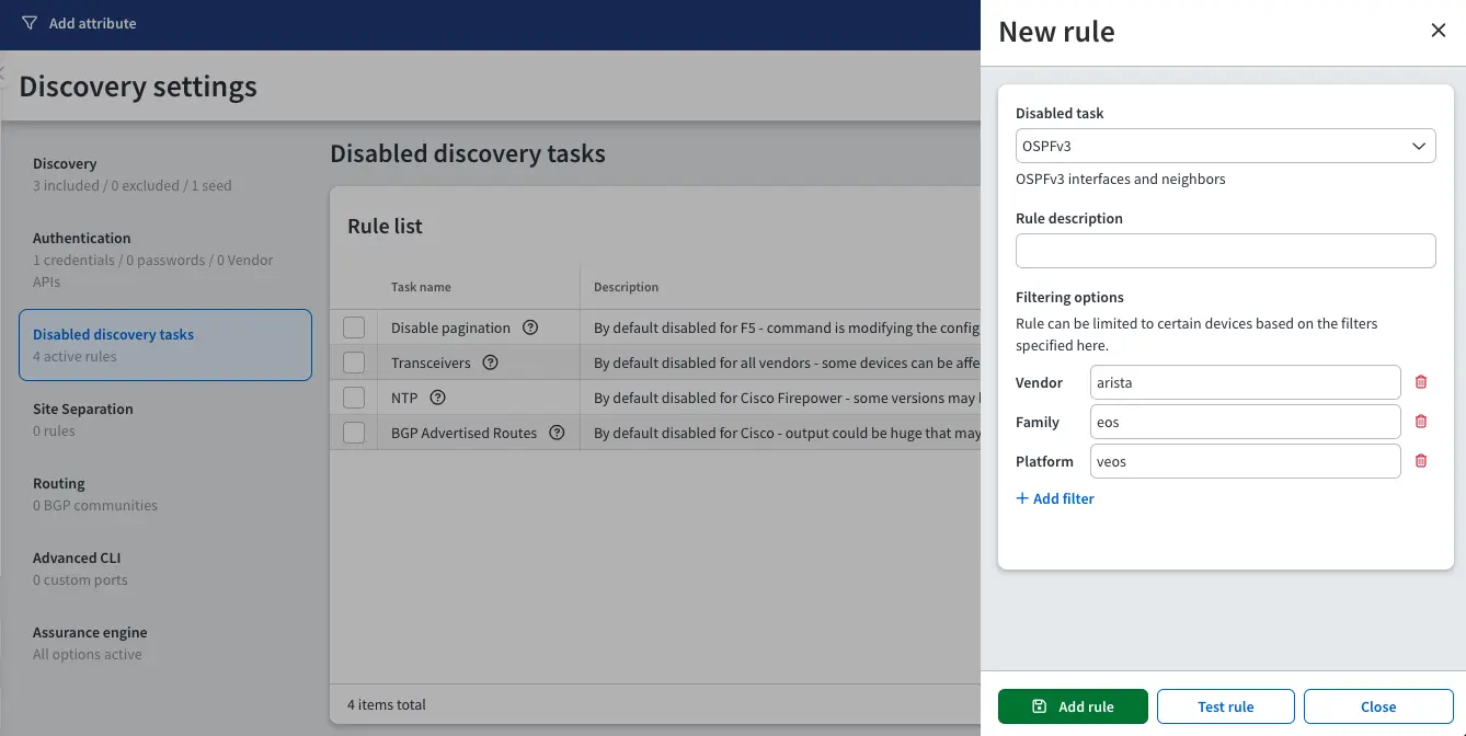In the following example, we are creating a rule for disabling OSPFv3 on Arista vEOS. The test for the rule reveals 4 matches.