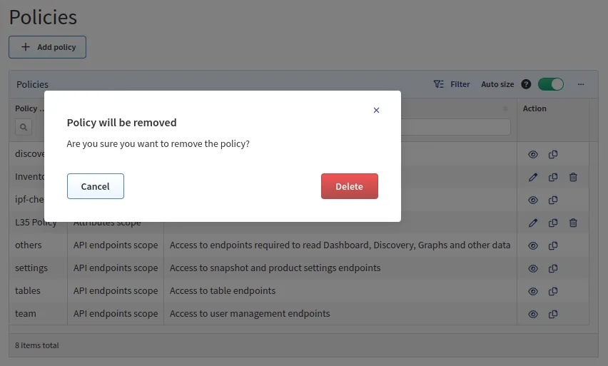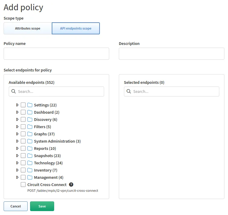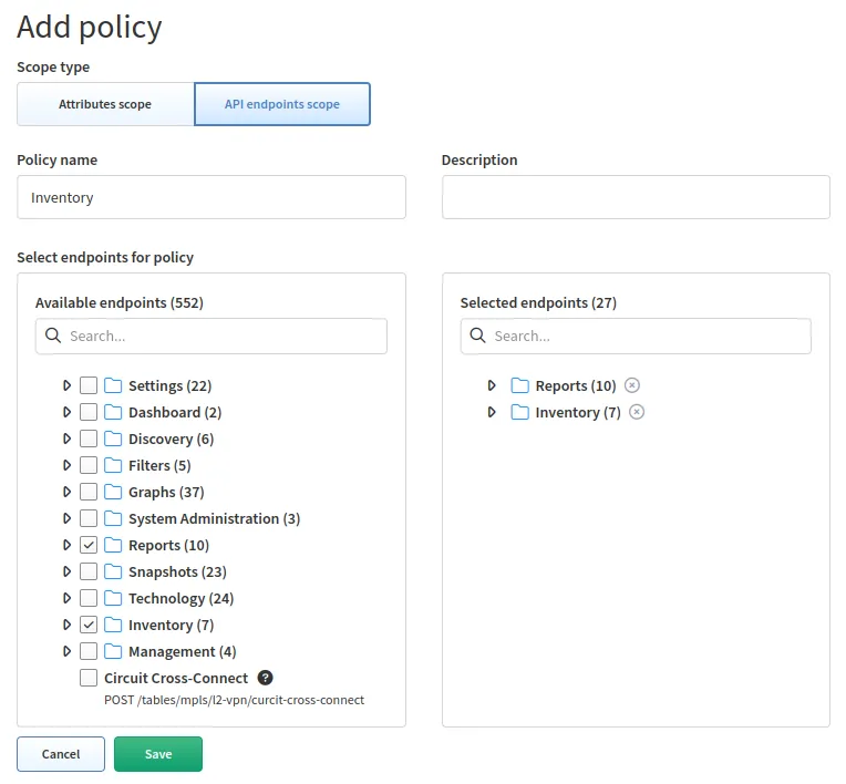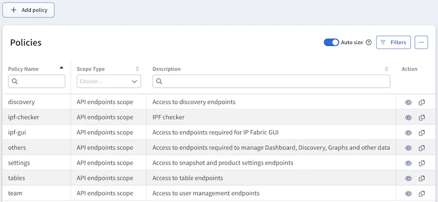 API endpoints scope defines actions that are permitted for end users to perform on allowed devices or on the system. Access is defined only to a specific API endpoint within IP Fabric (e.g., a discovery policy allows access to discovery API endpoints (actions)).