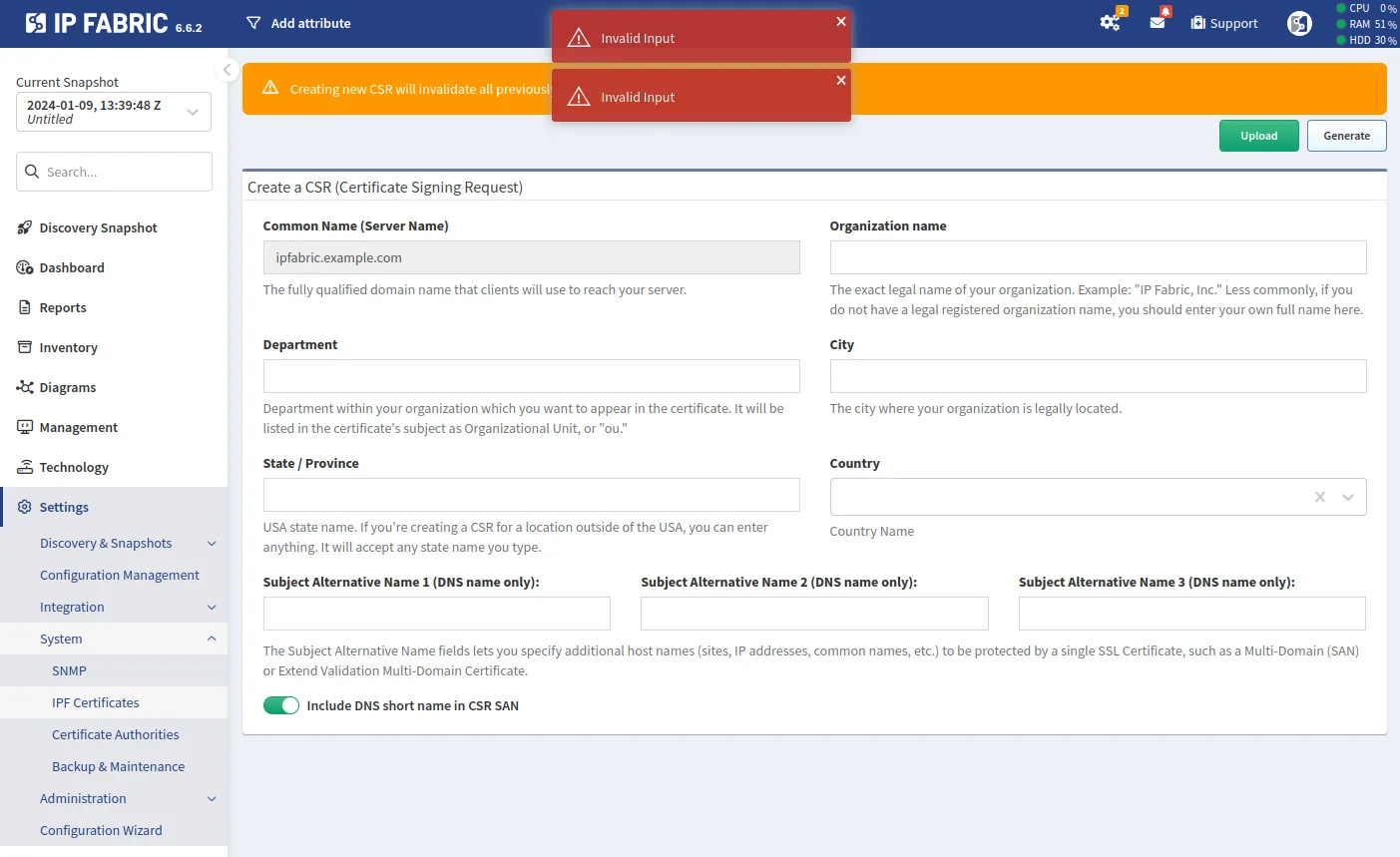 Only a certificate that was created by signing the most recent CSR can be uploaded to IP Fabric! If you generate another CSR before uploading the certificate created from the previously generated CSR, the certificate will not be applied.