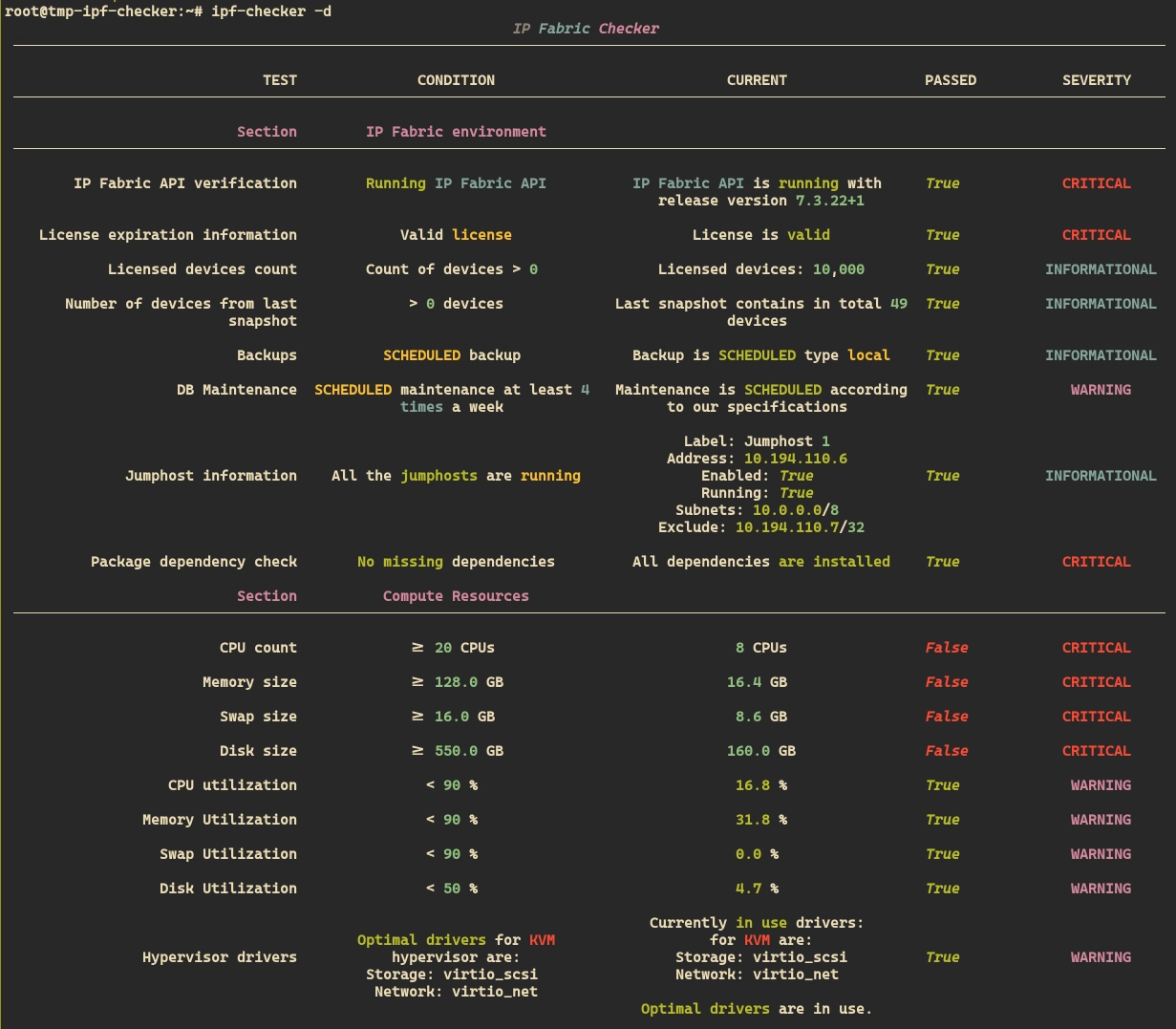 Resource validation tool for the IP Fabric appliance that displays a table in the terminal and shows the results of various environment checks in real time.