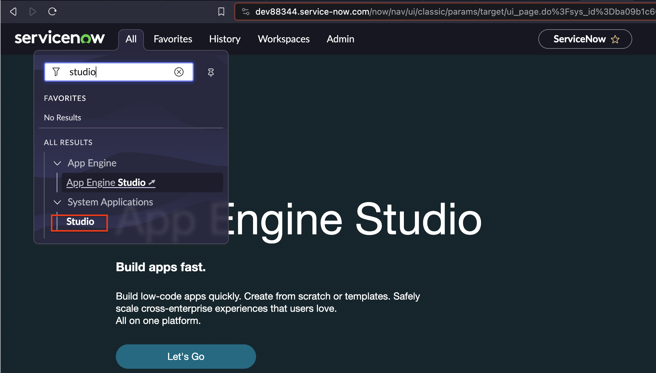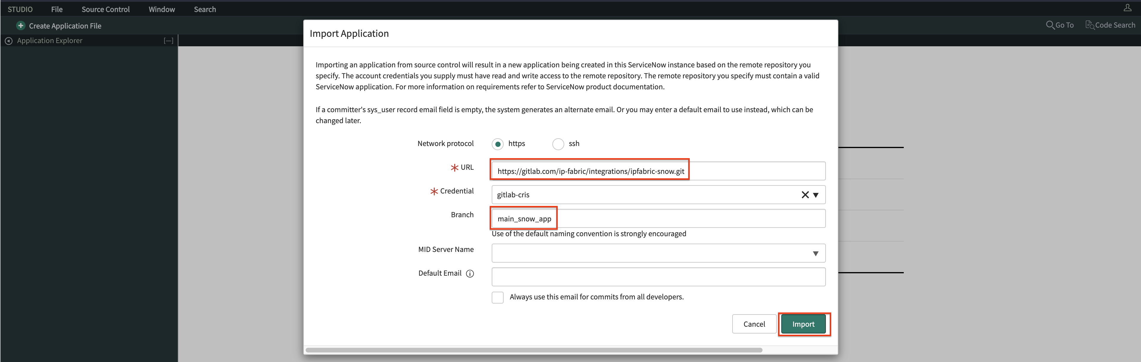 This section requires access to the System Application Studio in ServiceNow. Please reference ServiceNow’s documentation on Importing an Application from Source Control for required roles and more information.