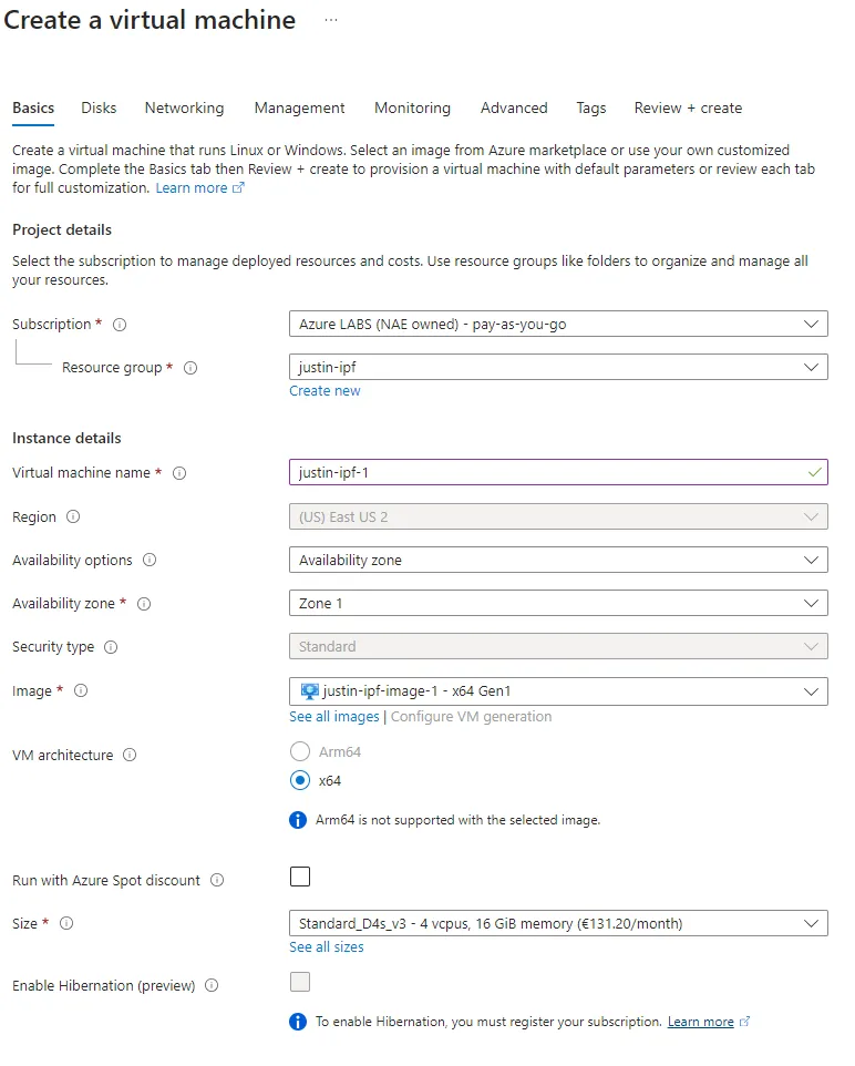 Accelerated networkingandHibernation supportedoptions disabled. - Set