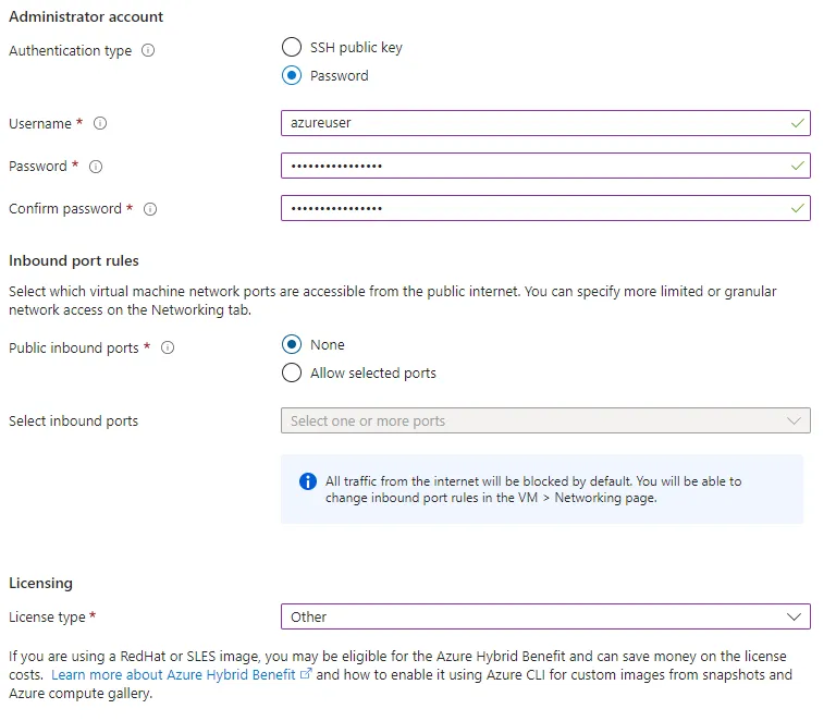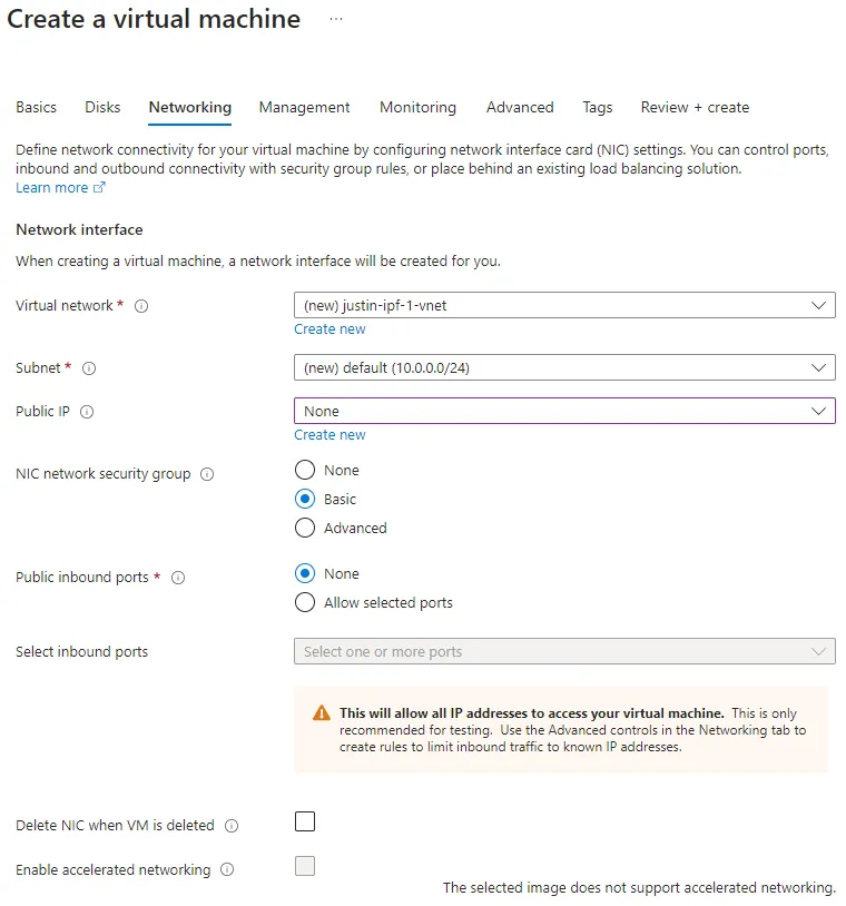 Inbound port rules > Public inbound portsshould be set toNone. -
