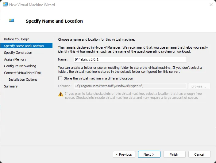 Create a new Hyper-V virtual machine and specify its Name and Location:
