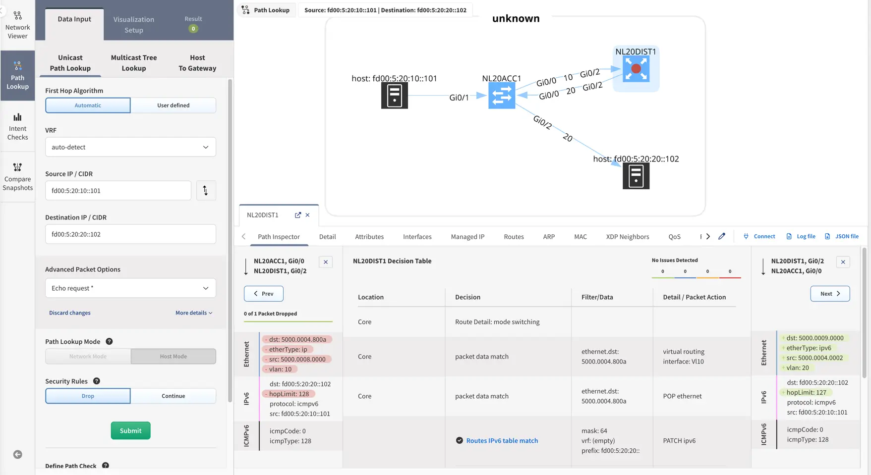 Path Lookup has been extended to support IPv6 for both Unicast and Host to Gateway scenarios. The following technologies are now supported for IPv6 path analysis: routing, security evaluation, 6in4, GRE, and IPsec.