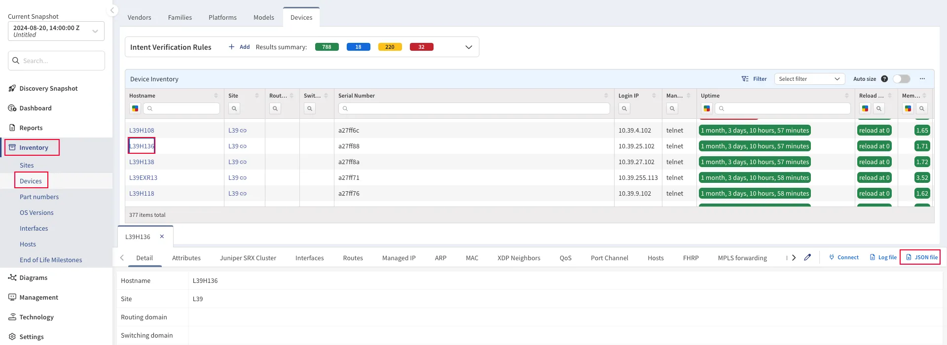 Device data can be now downloaded in JSON format. These are device data processed (parsed) by IP Fabric from the CLI logs, which are used when devices are added to IP Fabric during snapshot discovery or load.