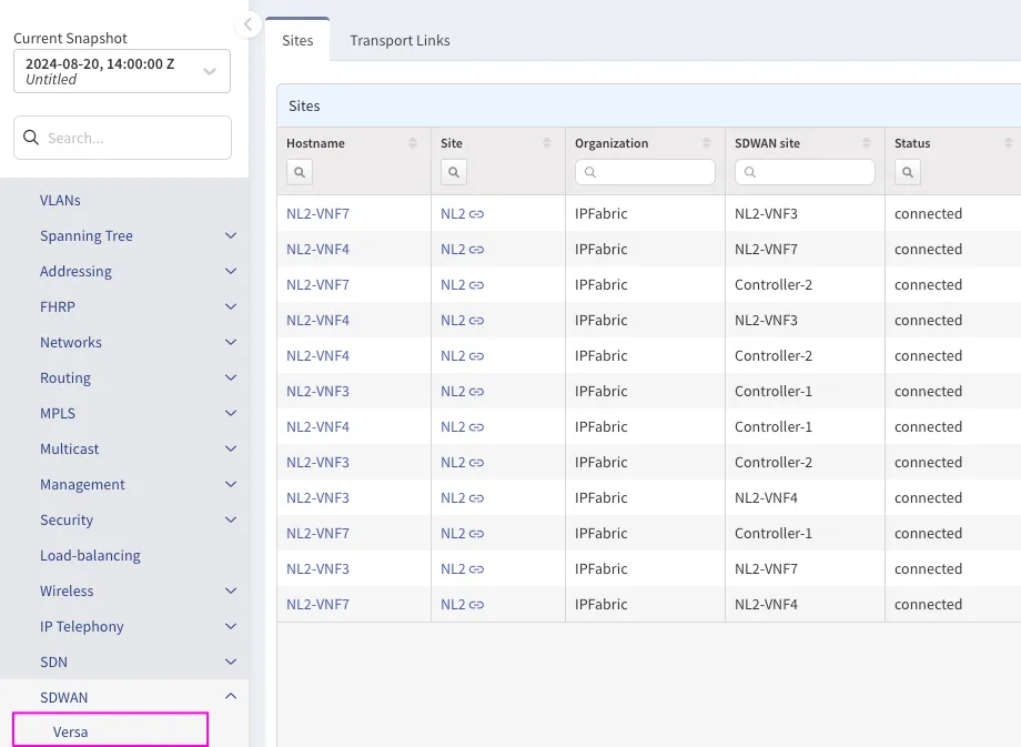 The Technology → SDWAN section of the GUI was previously dedicated to Versa SDWAN information only. In upcoming releases, this section will be enriched by data from other SDWAN vendors. For this reason, a separate page for Versa has been created.
