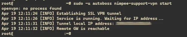 Repeat steps 1 and 2 from the How To Establish Support VPN section above if you logged out. Skip this step if you didn’t.